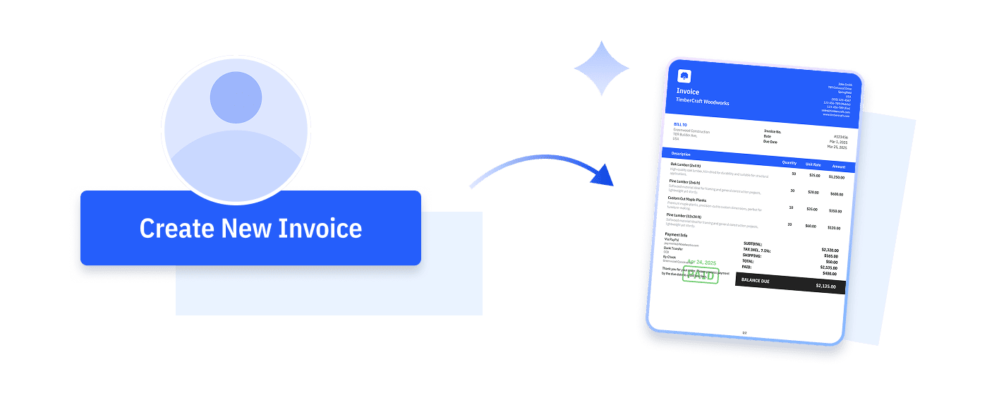 Generate a new invoice directly from the client profile. Save time by reusing stored details automatically.