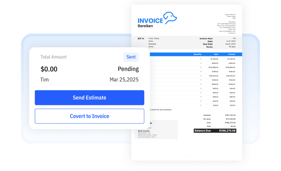 Your approved estimate already has everything—prices, quantities, project details. Let it become the invoice with one click, exactly as agreed, without retyping a single word.